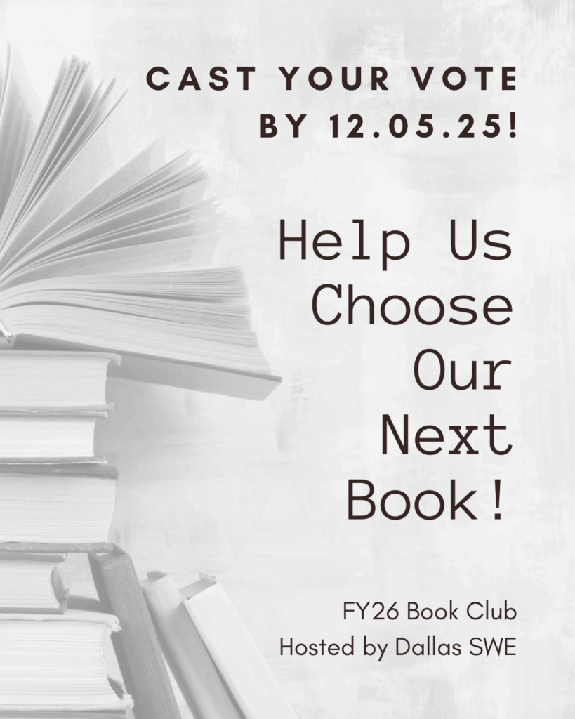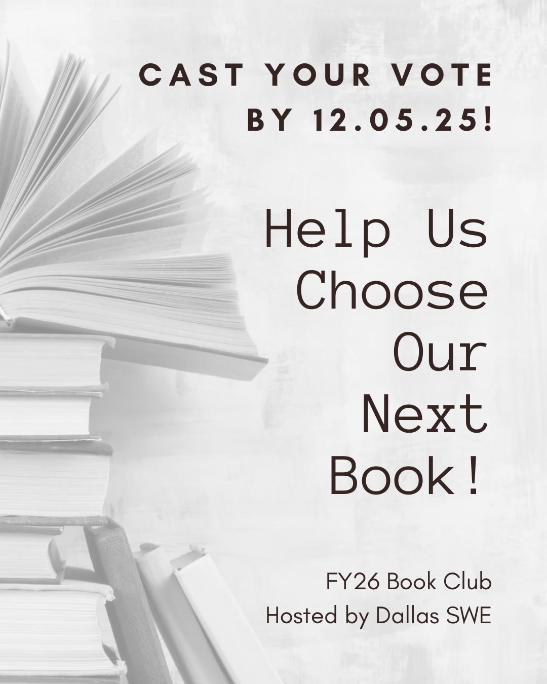 Voting is open for Dallas SWE Book Club’s next read! Submit your preference here and the next read will be announced at the meet up on Dec 6.