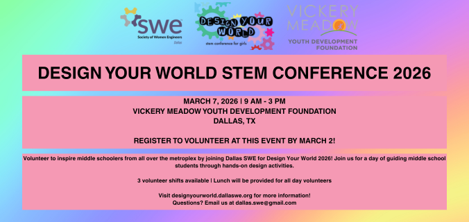 Volunteer to inspire middle schoolers from all over the metroplex by joining Dallas SWE for Design Your World 2026! Join us for a day of guiding middle school students through… [Continue Reading]